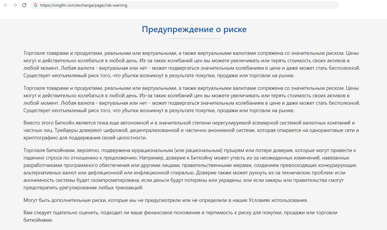 Мошенническая организация ОМГ ФИН предложила пользователям предупреждение о рисках, в котором рассказывают о том, что торговля это очень рискованное дело, а так же из за цен на криптовалюту клиент может лишиться всего, и остаться с пустыми карманами, и для этого стоит самим решить нужно это или нет.