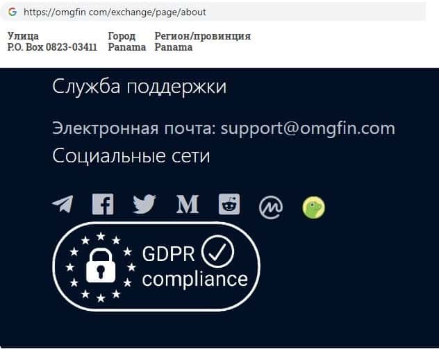 У аферистов ОМГ ФИН практически нет контактных данных, что очень странно для криптовалютной биржи. Указан лишь адрес электронной почты. Но фирма неоднократно говорит о том, что нацелены на социальные сети, а значит именно там происходит общение с клиентами, и там жулики убеждают пользователей в то, что нужно вносить деньги. Контакты аферистов: