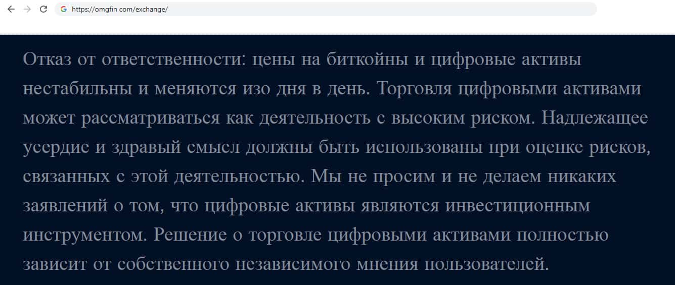Так же на своём главном интернет ресурсе, махинаторы OMGFIN представили отказ от ответственности, в котором идёт речь о том, что они никакую ответственность не несут ни за что. Если окажется, что клиент компании лишился всех своих средств из за самой фирмы, то жулики будут ссылаться на предупреждение о рисках и отказ от ответственности.