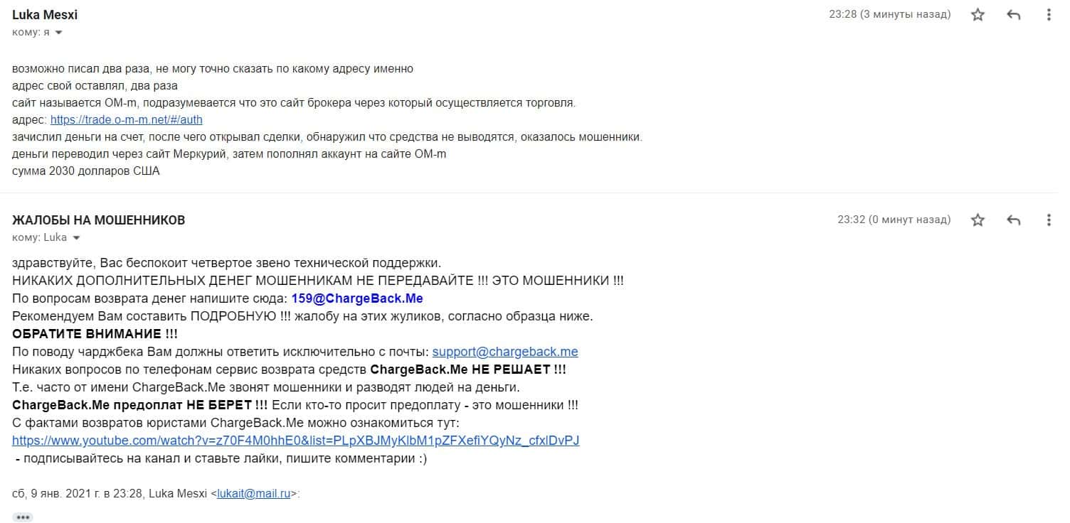 На почтовый адрес сайта по сбору информации о деятельности мошенников форекс пришло письмо с жалобой на интернет-лохотрон ОМ-м, в том числе и Мерикурио.