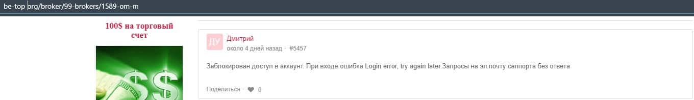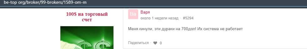 Человек в своем отзыве рассказал, что лохотронская контора ОМ-м кинула его на 700 долларов. Они обещали определенный заработок, но как оказалось их система не работает.