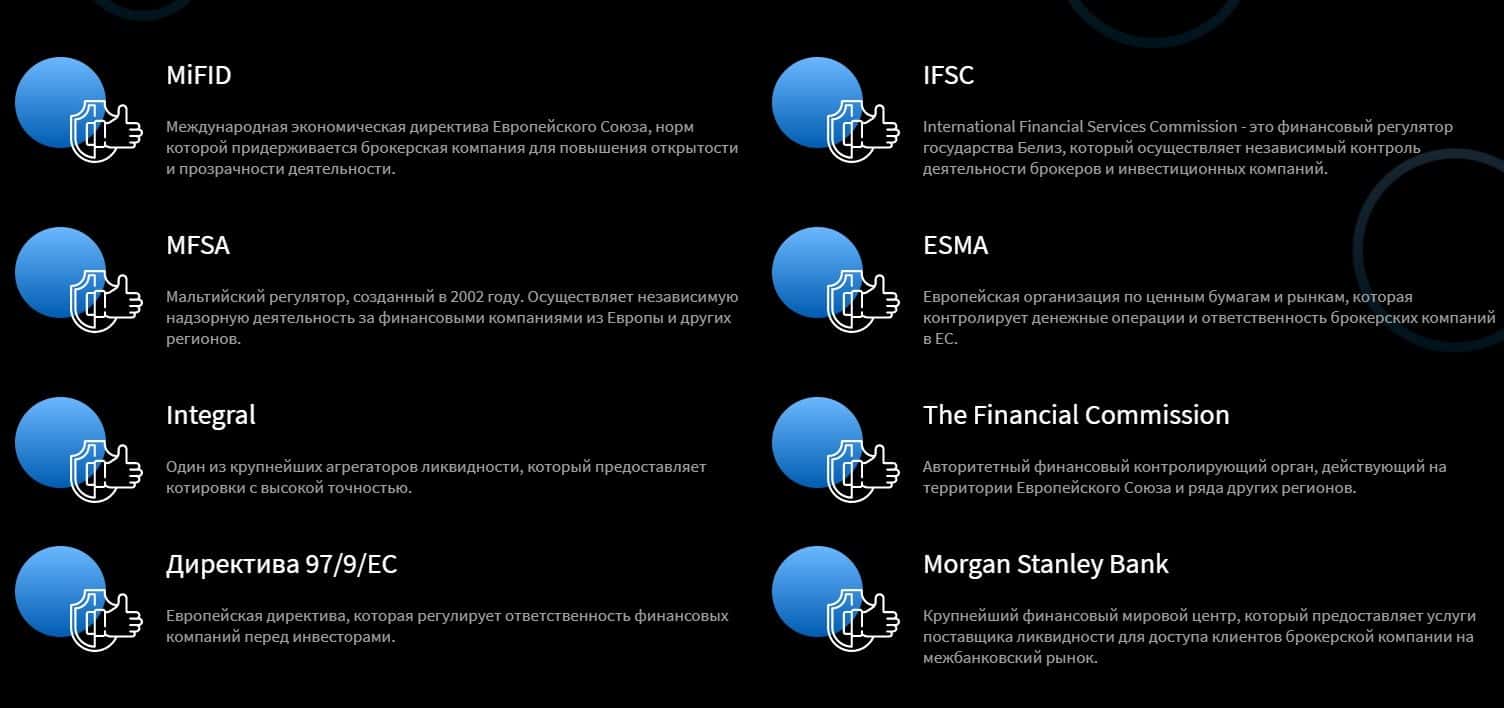 Что касается регуляции деятельности ОМ-м, то здесь мошенники указали много упоминаний о различных регуляторах, хотя на самом деле не указали ни одного конкретного подтверждения.