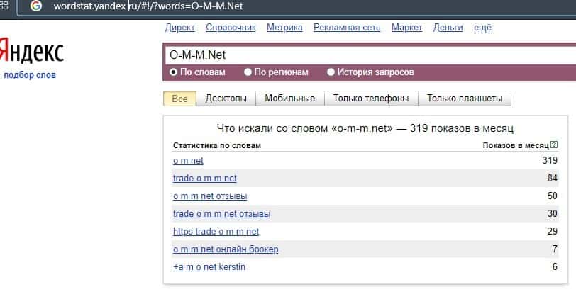 Запрос бренда мошенников "OM-m" в базе Яндекс.Вордстат набрал 4105 показа в месяц, поэтому можно смело считать, что в интернет-сообществе они довольно популярны.