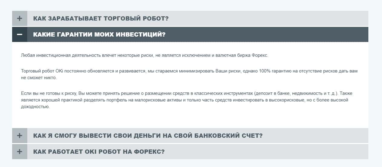 После на подвальном сайте у проходимцев One Key Invest следуют довольно сомнительные ответы на очевидные вопросы пользователей, в которых мошенники Ван Кей Инвест снова вешают лапшу на уши о своей подвальном сайте, который занимается кидаловом людей. На изображении, расположенном ниже, вы можете наглядно увидеть данный раздел сайта шулеров.