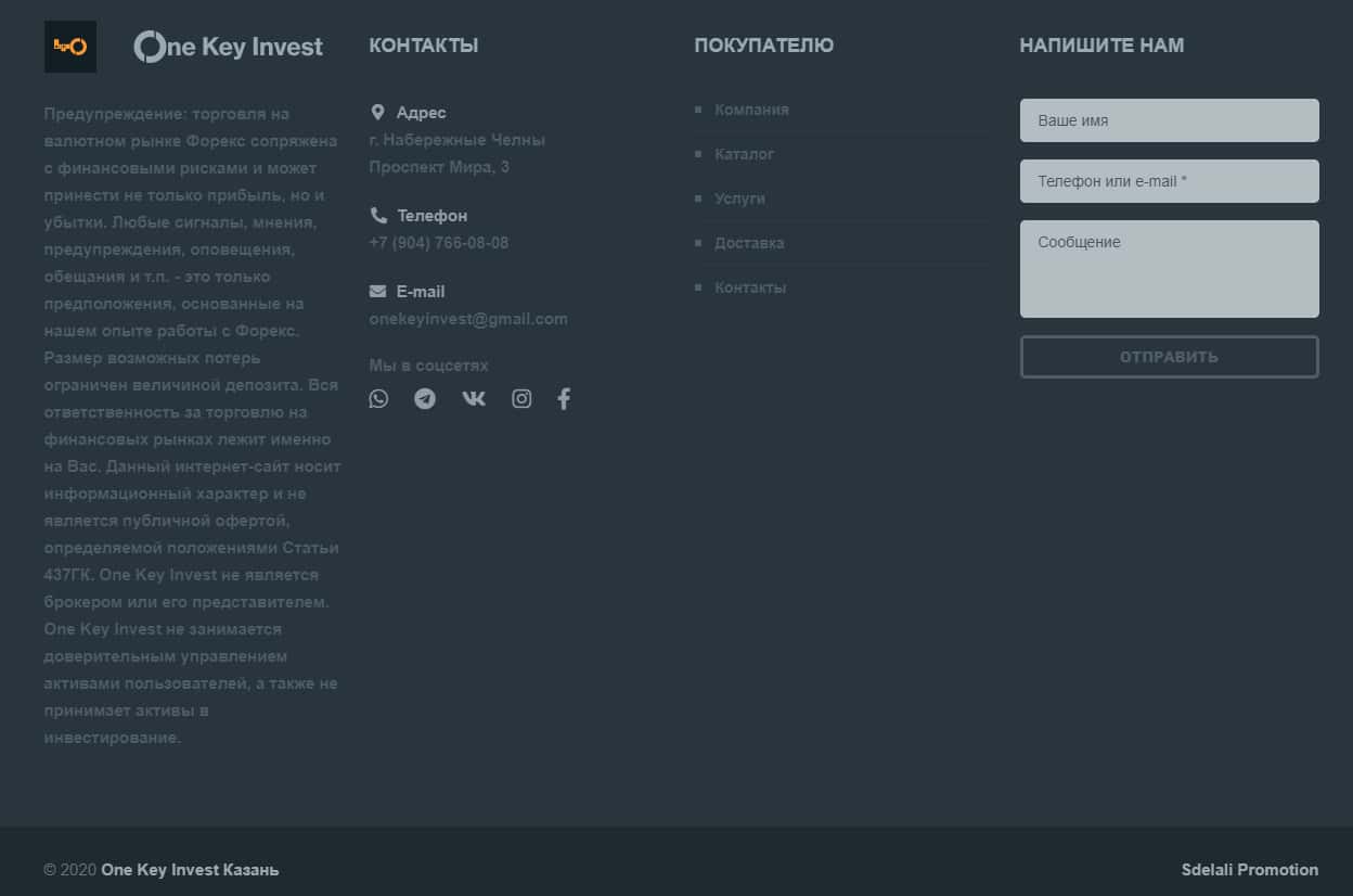 Завершается же сайт у аферистов Ван Кей Инвест довольно стандартным и типичным предупреждением о рисках потери средств наивной клиентурой в данной конторе, а так же формой для обратной связи с мошенниками One Key Invest. На изображении, расположенном ниже, вы можете наглядно увидеть окончание подвального сайта аферистов Ван Кей Инвест.