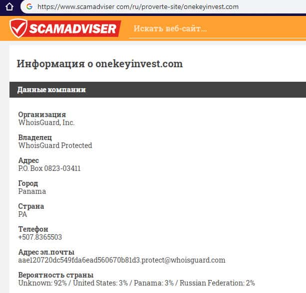 В связи с мошеннической и противозаконной деятельностью лохотрона One Key Invest его реальные руководители предпочитают анонимность дабы избежать ответственности со стороны правоохранительных органов. Техническую же информацию о сайте жулья Ван Кей Инвест можно узнать с помощью портала scamadviser com, что вы можете наглядно увидеть ниже.