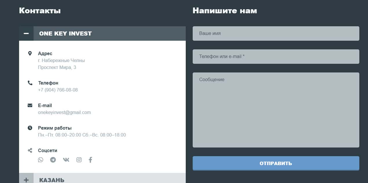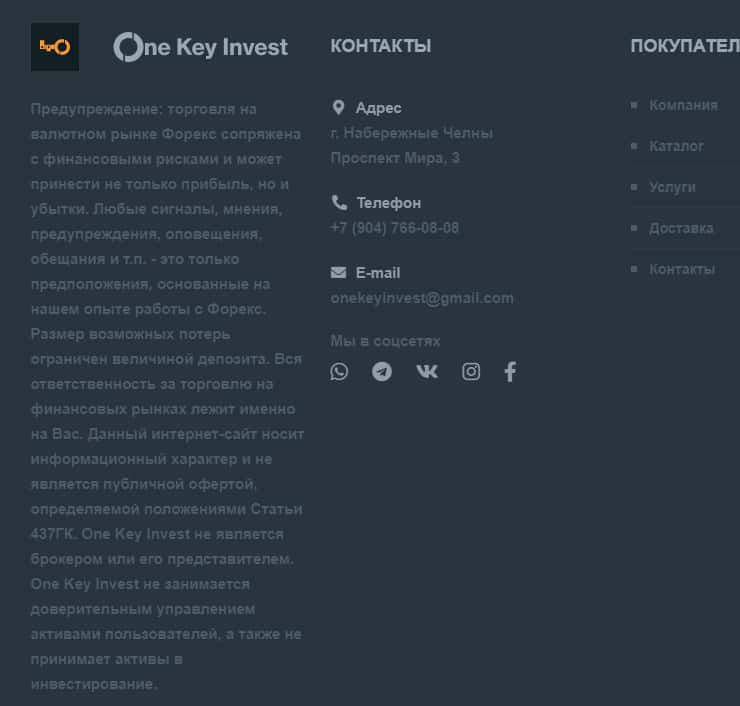 Под свои довольно сомнительные контакты мошенники One Key Invest отвели отдельный раздел своего подвального сайта, в котором перечислили нормальное количество контактов, однако их реальность и правдивость довольно сомнительные, что говорит о халтурности жулья. Итак ниже перечислим указанные на подвальном сайте проходимцами Ван Кей Инвест контакты: