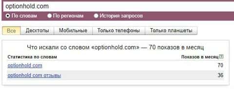 По поводу поиска сайта лохотрона по бренду его сайта "optionhold.com", то значения показов в поисковой системе Яндекс насчитывают порядка 70 показам.