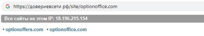 На веб-площадке довериевсети рф была обнаружена информация о том, что сайт мошеннической организации OptionOffice находится на одном ip-адресе с сайтом скам-конторы OptionOffers. В таком случае доверять данной организации не рекомендуем, поскольку это одна группа мошенников, которая действует сообща и сливают друг другу контакты клиентов.