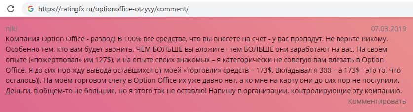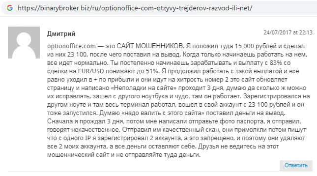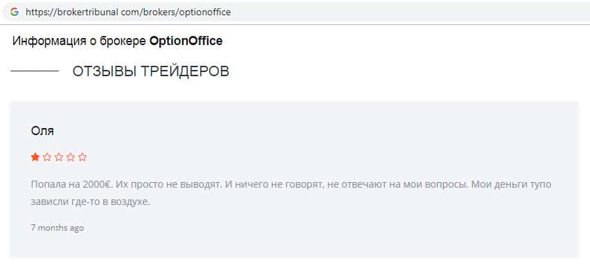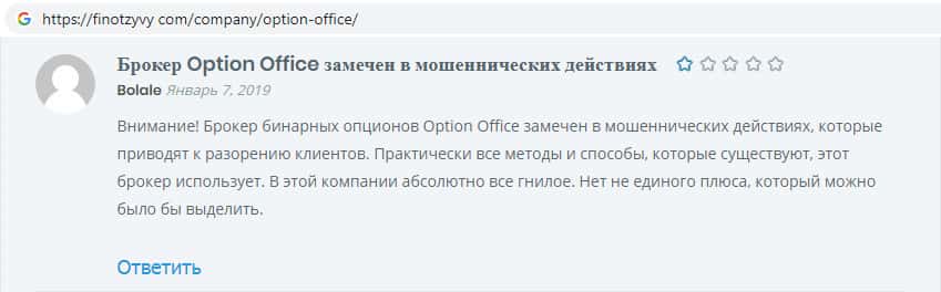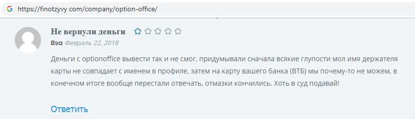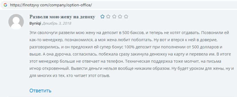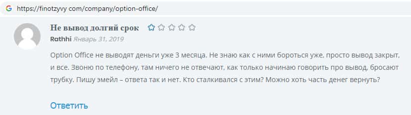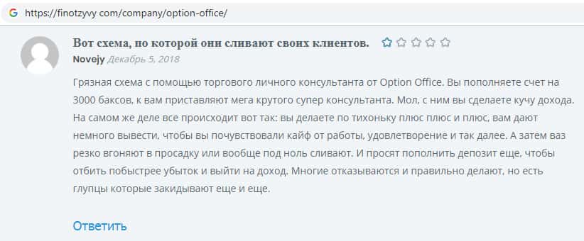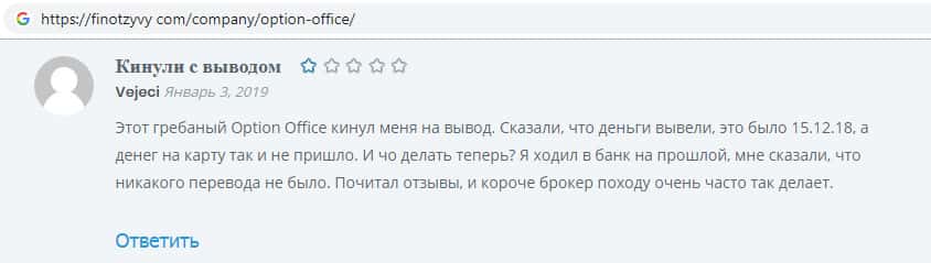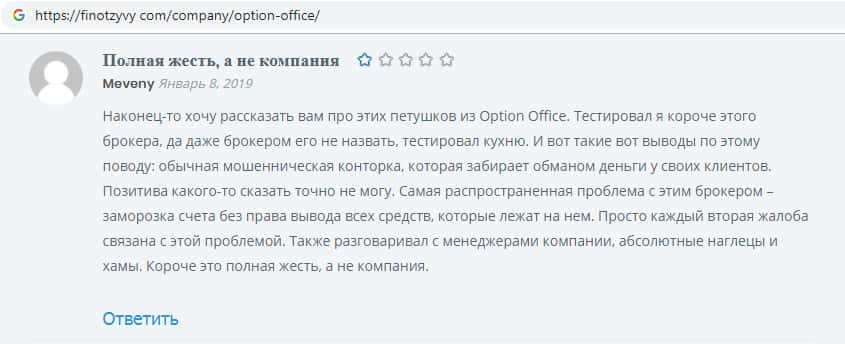 На веб-сайте finotzyvy com был найден комментарий о том какое впечатление складывается у пользователей глобальной сети интернет о мошенниках OptionOffice, которые забирает деньги клиентов обманным путем, замораживая счета клиентов без права на вывод средств. Такая жульническая уловка очень распространена среди подобных скам-контор.