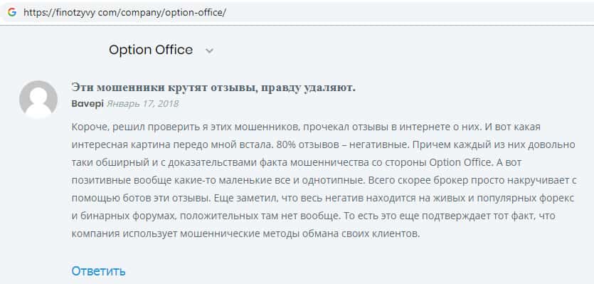 Мошенники Опцион Офис удаляют отзывы в интернет сети, а так же опубликовуют якобы положительные отзывы, которые вводят пользователя в заблуждение. Подтверждением этому является ниже представленный комментарий, который был замечен на сайте-отзовике finotzyvy com.