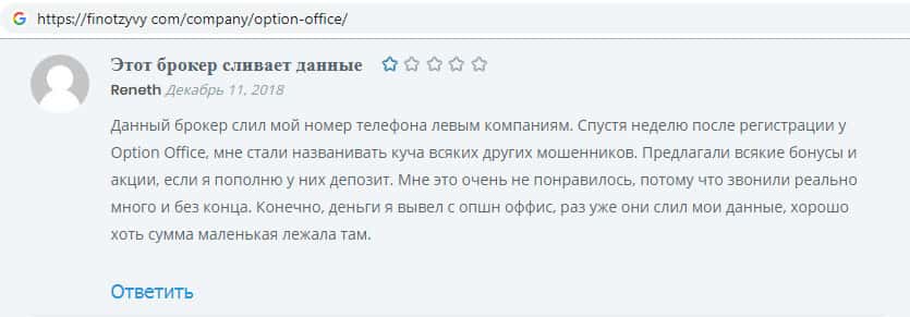 На сайте-отзовике финотзывы ком отыскан комментарий о деятельности брокерской конторы Опцион Офис. Будьте осторожны и не связывайтесь с OptionOffice, потому что они сливают все данные жульническим конторам, с которыми сотрудничает. Оставив свой номер телефона на сайте данной конторы приготовьтесь к тому, что Вам будут названивать с разных номеров.Техническая поддержка организации Опцион Офис оставляет желать лучшего