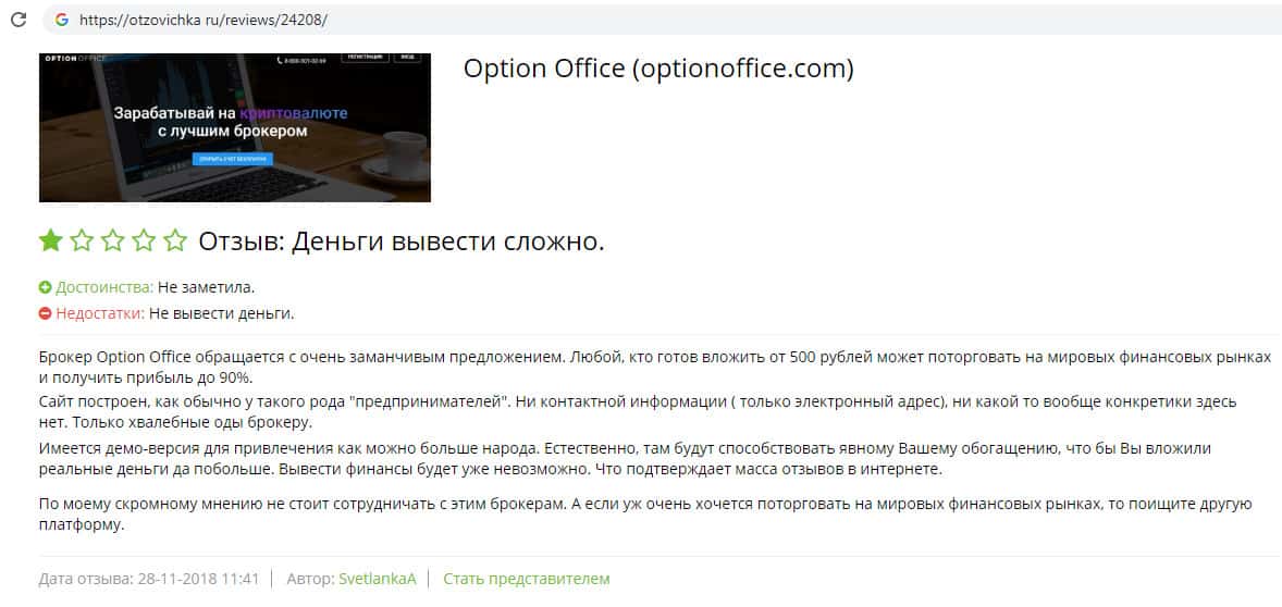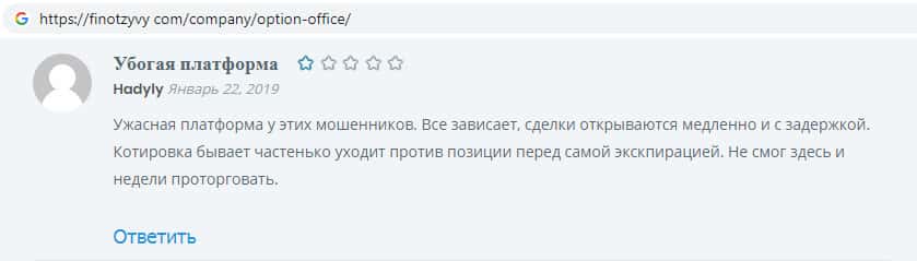 На веб-сайте finotzyvy com был найден пользовательский отзыв о том, что брокер OptionOffice умеет обманывать людей. Официальный сайт данной мошеннической организации зависает в нужный момент, особенно при выводе денежных средств со счета клиента.