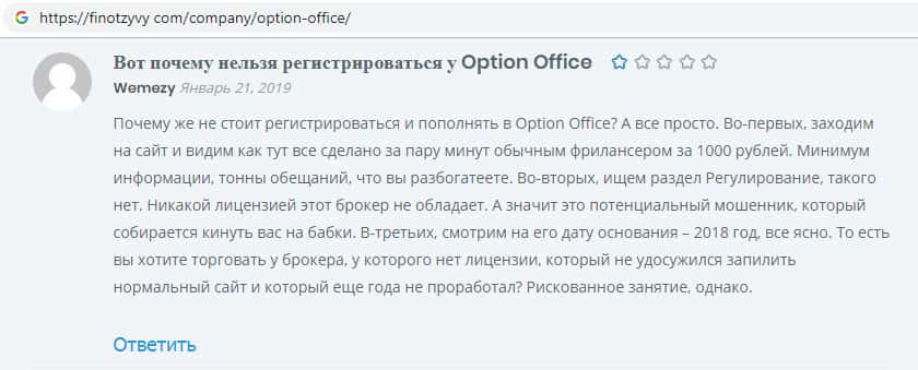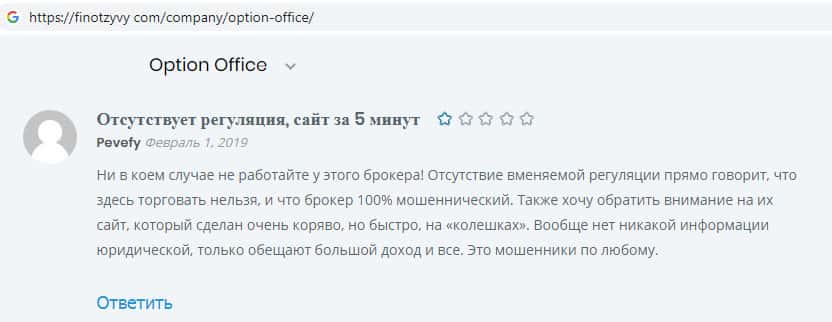 На сайте-отзовике finotzyvy com был обнаружен коммент о том, что сайт скам-организации OptionOffice липовый. Отсутствие регуляции конторы Опцион Офис говорит о том, что на этом сайте торговать нельзя, потому что сайт мошеннический, не имеющий никакой юридической информации.