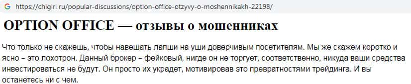 На информационном сайте chigiri ru найден комментарий, свидетельствующий о том, что сайт аферистов OptionOffice фальшивый. Данная компания - стандартный интернет-лохотрон, который создан для того, чтобы разводить людей на немалые суммы денег. Поэтому думайте прежде чем связываться с конторой Опцион Офис !!!