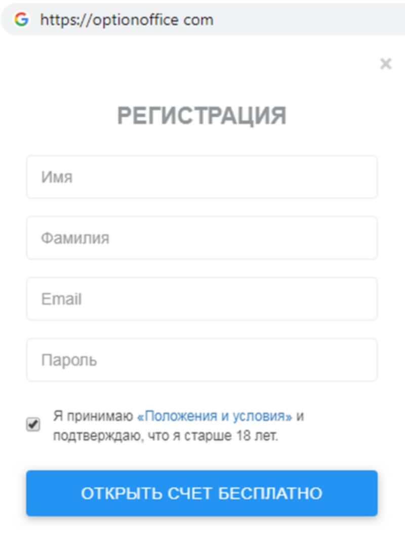 Для того, чтобы зарегистрироваться на сайте аферистов Опцион Офис необходимо назвать имя, фамилию, адрес электронной почты и пароль, и конечно же подтвердить то, что Вы принимаете положения и условия пользования сайтом. Прежде чем заполнить бланк и зарегистрироваться, хорошо подумайте стоит ли так рисковать своими денежными средствами?