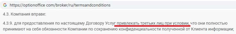 Контора Опцион Офис имеет право привлекать третьих лиц, каких именно скам-организация не указывает. Третьими лицами могут быть мошеннические организации, которые сотрудничают с OptionOffice и имеют возможность передавать информацию о своих клиентах.