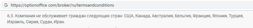 Согласно указанной информации на сайте скам-брокера OptionOffice, данная жульническая организация не обслуживает граждан таких стран как: США, Канада, Австралия, Бельгия, Франция, Япония, Израиль, Сирия, Судан, Иран. Мошенники забыли написать о том, что не имеют права предоставлять свои брокерские услуги в России.