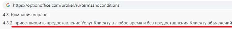 Внимательно прочитав клиентское соглашение компании Опцион Офис была найдена информация о том, что данная скам-организация вправе прекратить предоставлять свои якобы брокерские услуги клиенту когда им вздумается, то есть в любое время и без особых на то причин.