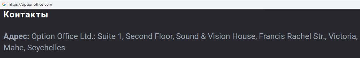 Интернет-лохотрон под названием OptionOffice принадлежит юридическому лицу, находящемуся в одном из оффшоров. Место регистрации данной скам-организации на Сейшельских Островах, где зарегистрировано достаточное количество подобных брокерских контор. Это не дает им право оказывать свои брокерские услуги на территории РФ.