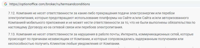 Контора OptionOffice может инициировать сбой в системе и виноват в таком случае будет клиент, поскольку данная организация будет винить в этом исключительно плохую работу программного обеспечения, либо же неисправность компьютерного оборудования клиента, но никак не саму торговую платформу на сайте.