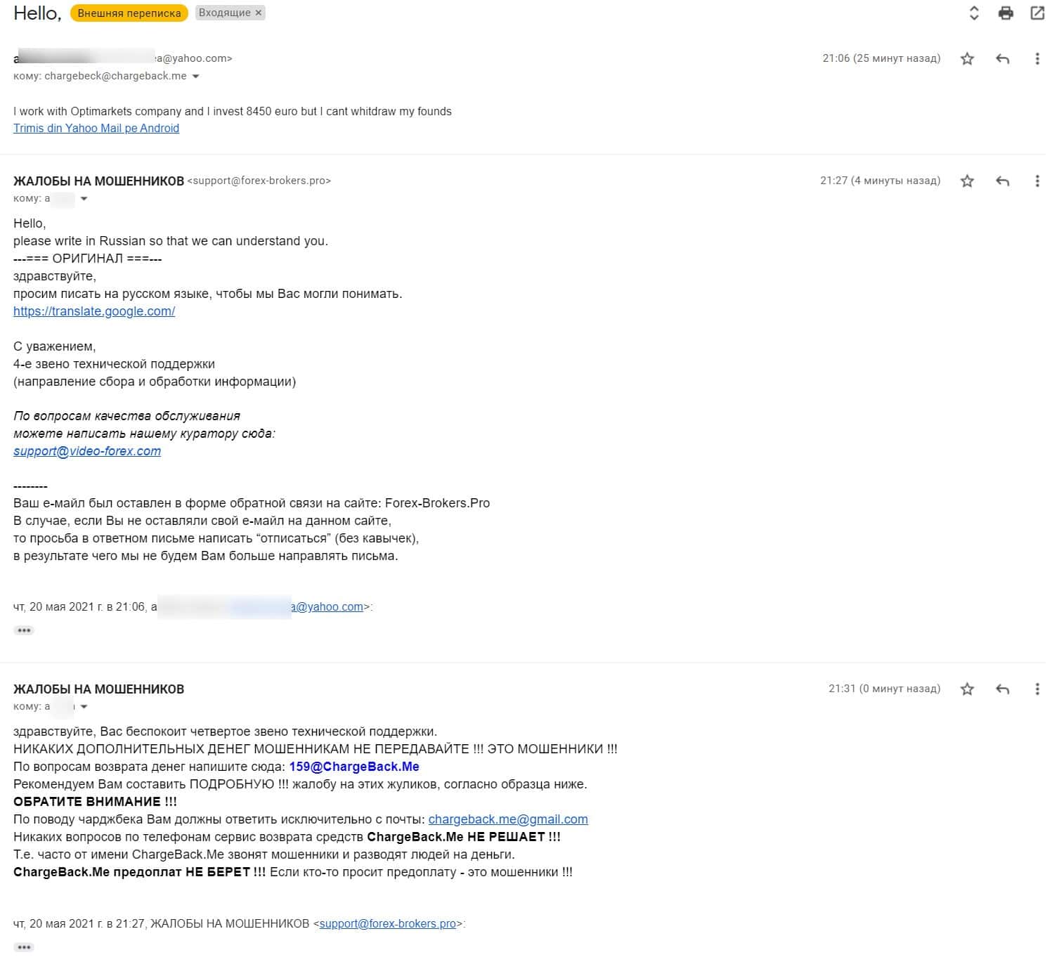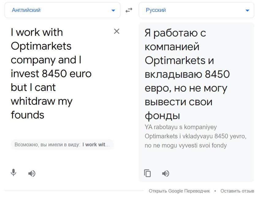 Далее предоставлена жалоба, которая поступила от одного пострадавшего клиента о том, что аферисты Опти Маркетс не вывели денежные средства, а именно 8450 евро.