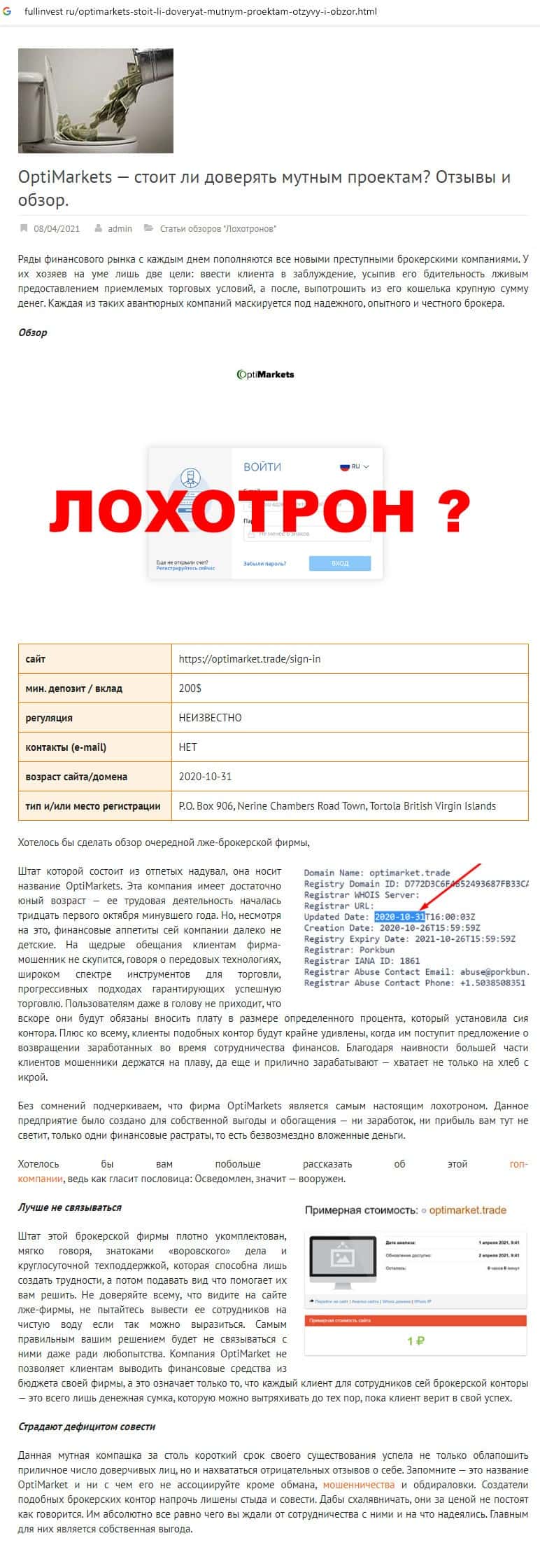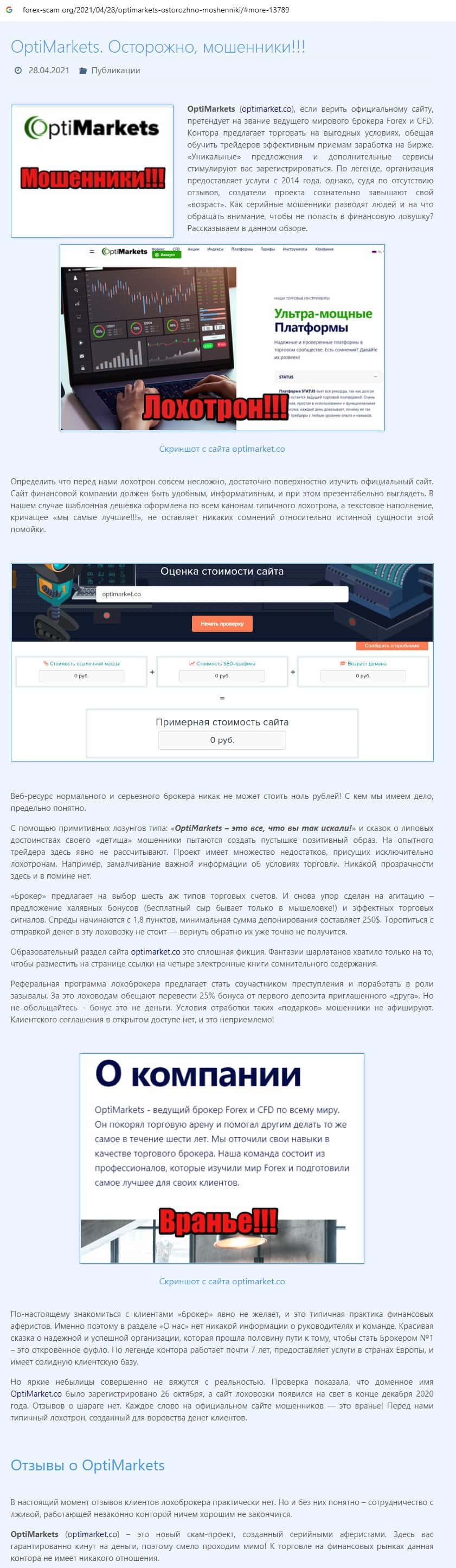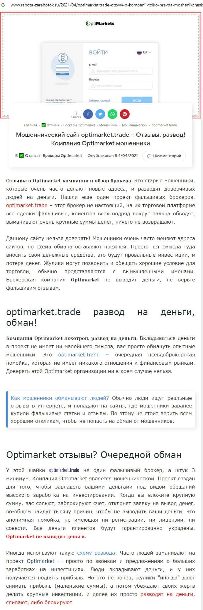 Далее предоставлена очередная статья-обзор о жуликах Опти Маркет, которые для развода людей на деньги используют несколько сайтов, всячески втираясь в доверие.