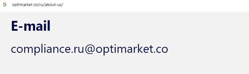 Лохотронщики OptiMarkets на своем официальном веб-портале указывают адрес электронной почты, а именно: