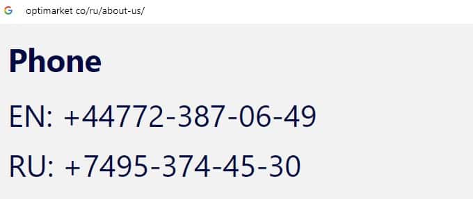 Аферисты Опти Маркет на своем дырявом сайте указали два номера контактного телефона, с которых навязчиво названивают потенциальным жертвам: