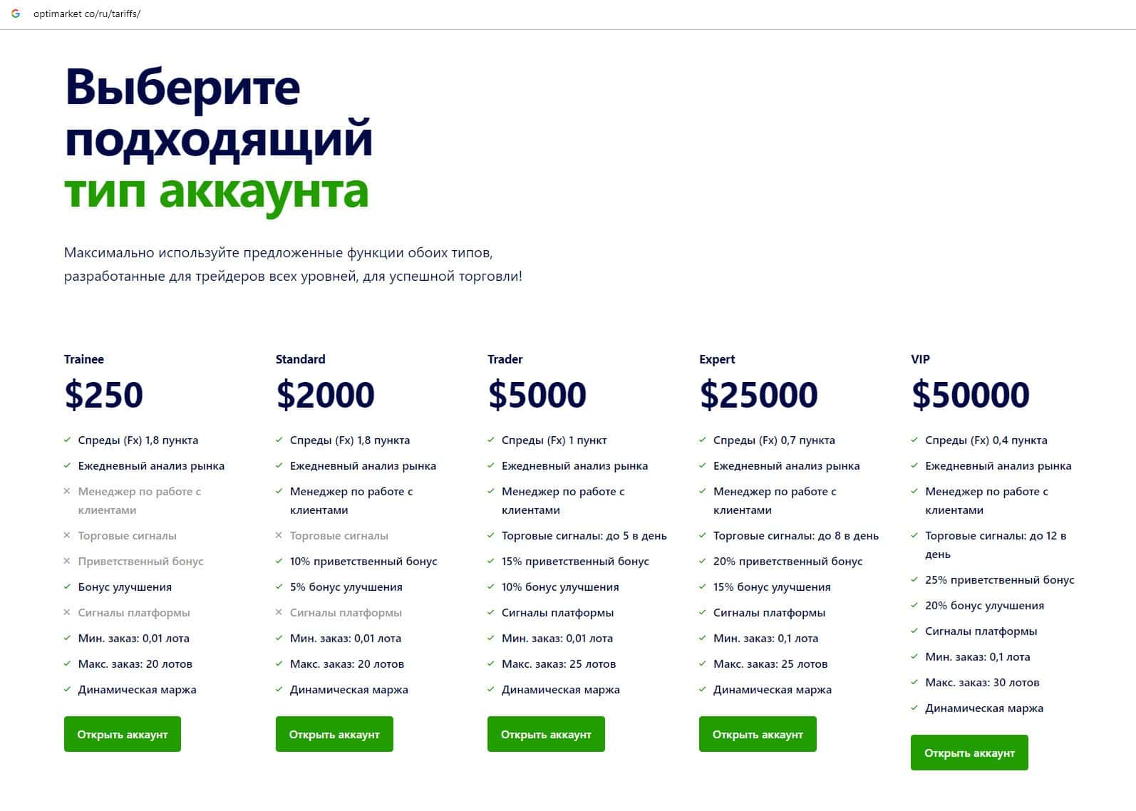 - Типы торгового счета на веб-портале мошенников OptiMarkets