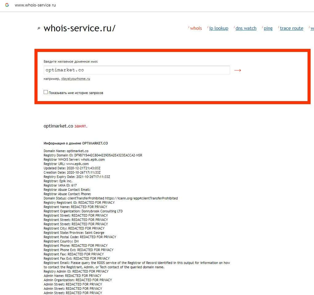 - Отсутствие данных о владельце домена обманщиков Опти Маркет