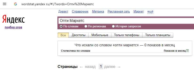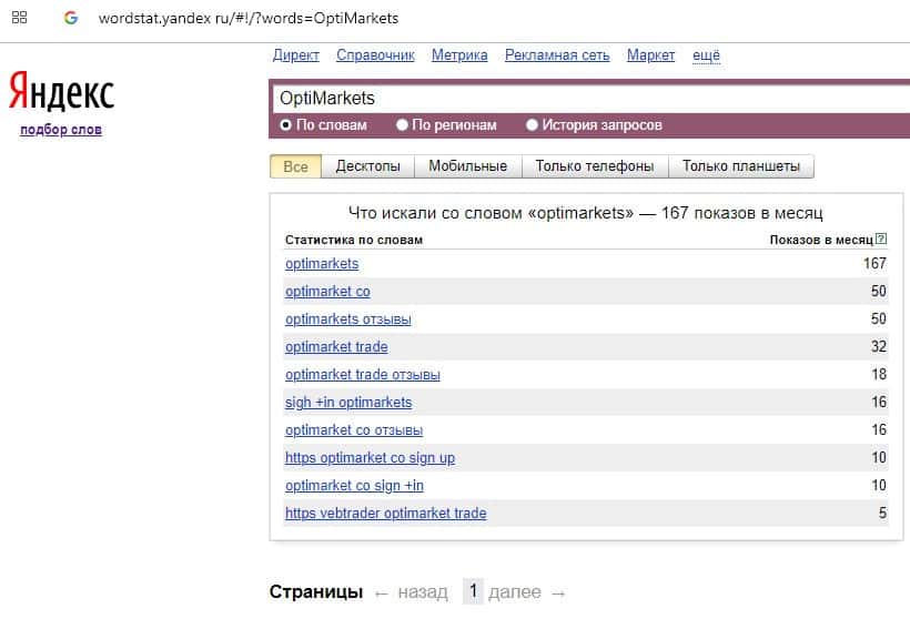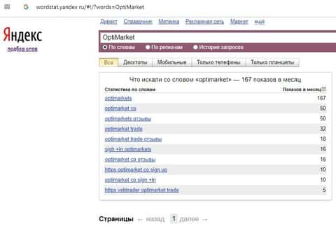 Количество брендовых запросов названия компании на русском языке "Опти Маркетс" на wordstat yandex ru вероятно равно нулю.