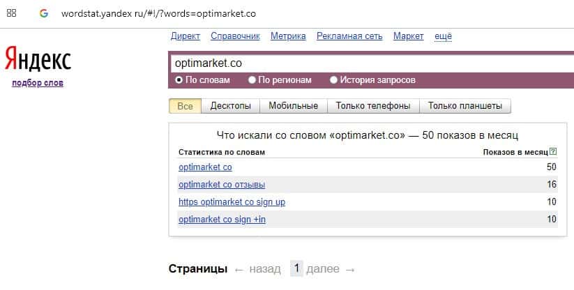 Количество брендовых запросов название домена компании "optimarket.co" в поисковике Яндекс составляет 50 показов за месяц.