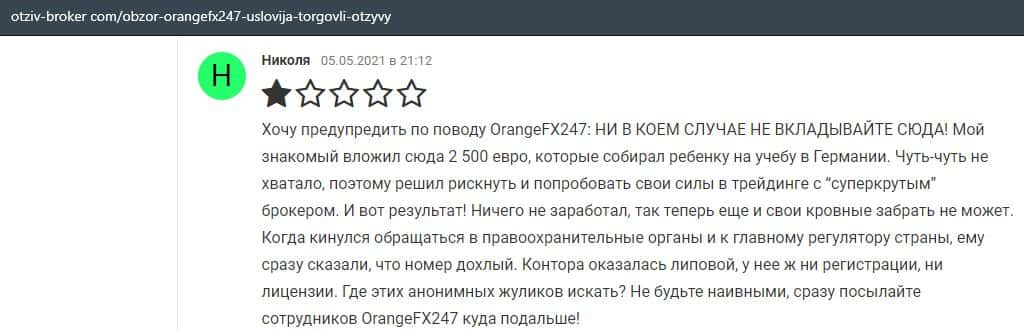 В еще одном отзыве описывается, что форекс-контора OrangeFX247 отказывается человеку выводить его вложения. Он вложил 2500 евро и теперь вывести их вообще невозможно.