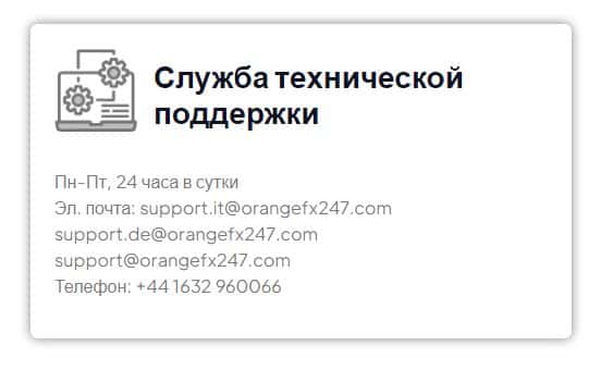 Далее представлена контактная информация о мошеннической конторе Орандж ФХ 247, где аферисты указали несколько адресов электронных почт и номер мобильного телефона: