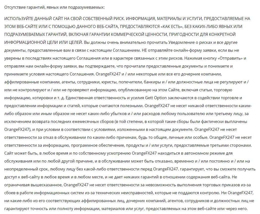 В соглашении мошеннической конторы OrangeFX247 указано, что они не дают никаких гарантий касательно своего сервиса и касательно сохранности денежных средств клиентов.