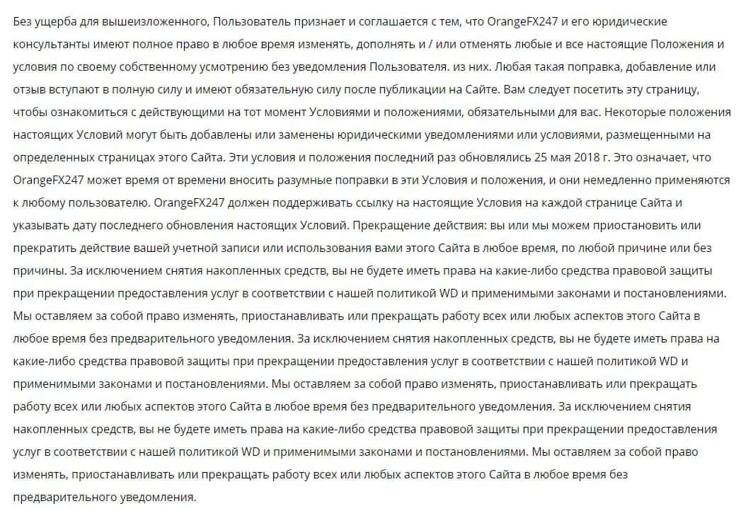 Далее представлена полная версия соглашения конторы OrangeFX247, где вы можете ознакомиться со всеми подводными камнями, которые вас ожидают в этой форекс-шараге.