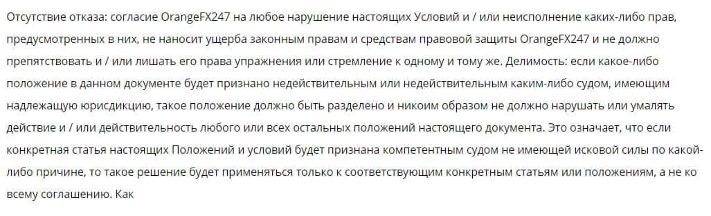 Также форекс-шарага OrangeFX247 оставляет за собой право не исполнять данное соглашение, при чем нести ответственность за это они не будут ни перед клиентами, ни перед законом.