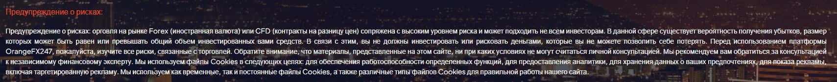 Что касается регуляции деятельности форекс-конторы Орандж ФХ 247, то жулики не указали ни одного подтверждения лицензии, а прикрываются лишь предупреждениями о рисках.