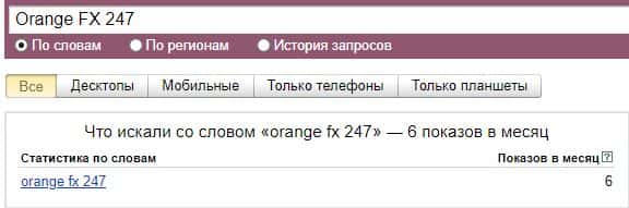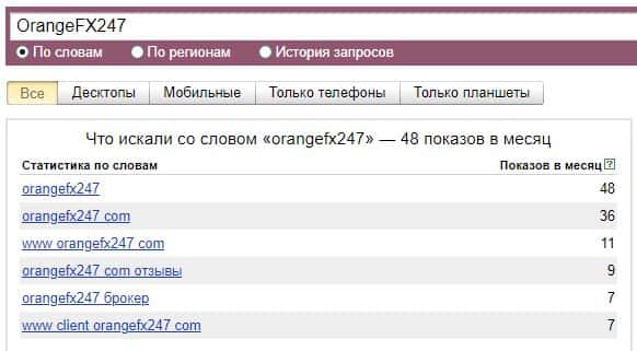 По запросу бренда "OrangeFX247" в поисковой системе Яндекс, контора набрала больше 40 показов и но это довольно низкий показатель.