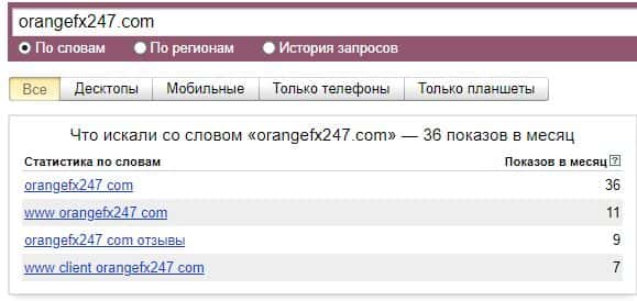 Такие же показатели и запроса бренда сайта с точкой. Бренд "orangefx247.com" набрал за последний месяц 36 показов по версии Яндекс.Вордстат.