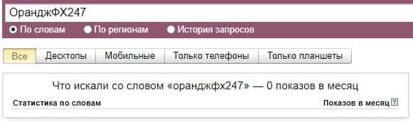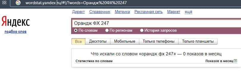 Что касается данной версии написания бренда кухни "Орандж ФХ 247", то здесь вообще нет запросов за последний месяц в системе Яндекс.
