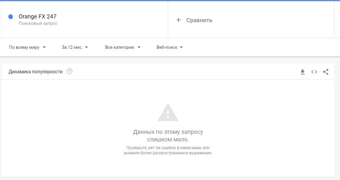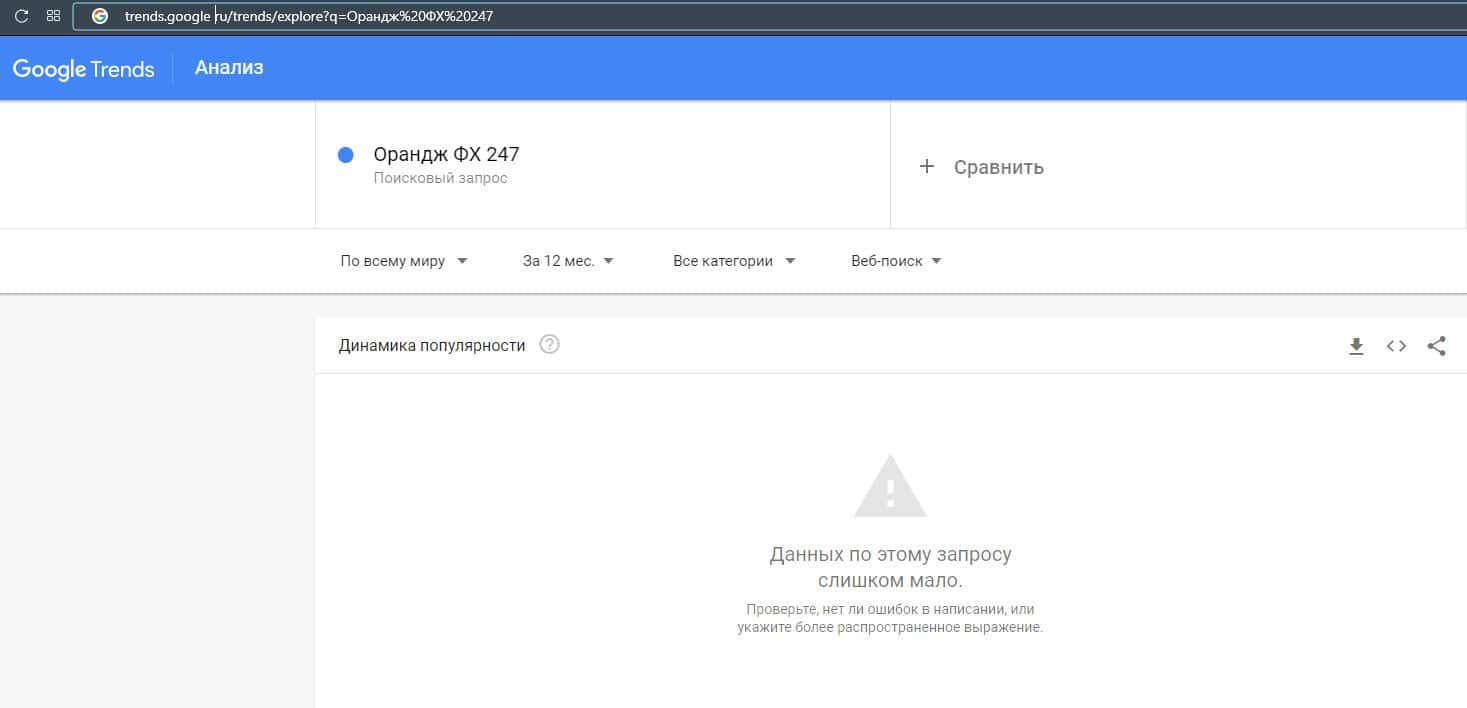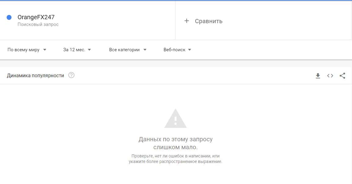 И конечно же проверка бренда "orangefx247.com" не помогло поиске Гугл найти показы за последнее время, что показывает их не популярность.