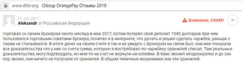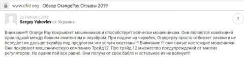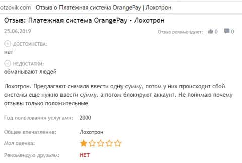 Также отзыв на сайте отзовик ком подтверждает озвученные ранее тезисы. Пользователь также отмечает, что Оранж Пей проплатили множество фейковых позитивных отзывов. Ничего общего с реальностью они не имеют, а основным занятием жуликов Orange Pay является присвоение клиентских денег себе. Будьте осторожны!
