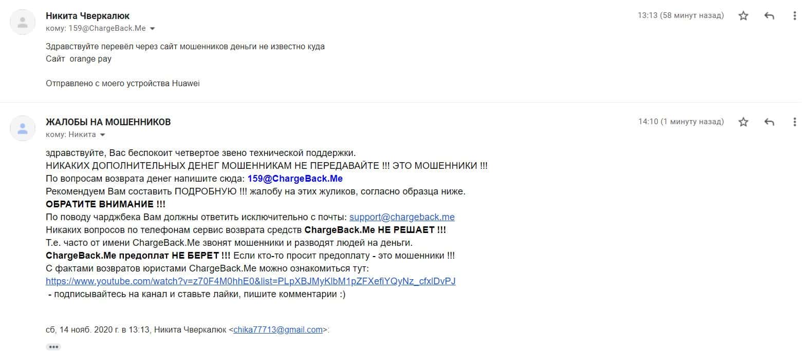 Вы можете спросить: ну как же мошенники Оранж Пей лишают клиента средств. Очень просто, ответим мы. Работая с этой шарашкой, клиент должен ждать пока платёжная система переведёт им чарджбэк. Только вот аферисты Orange Pay не возвращают клиентам средства, после того как их получили.