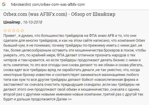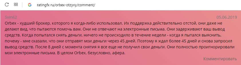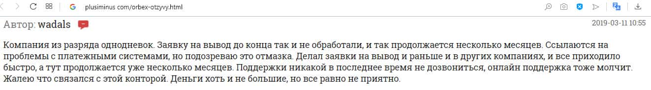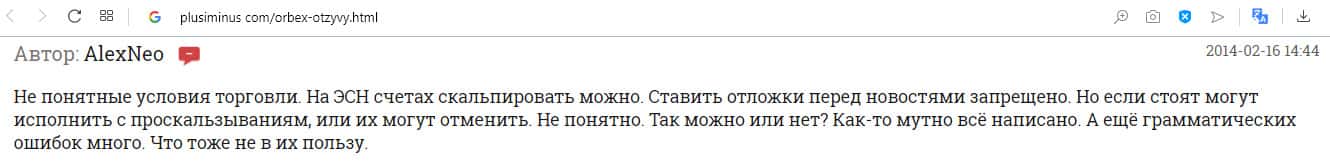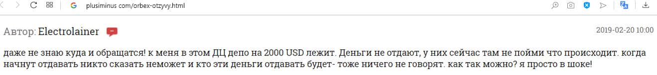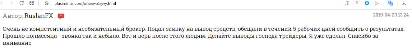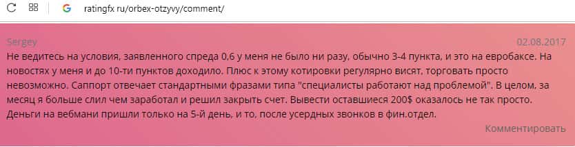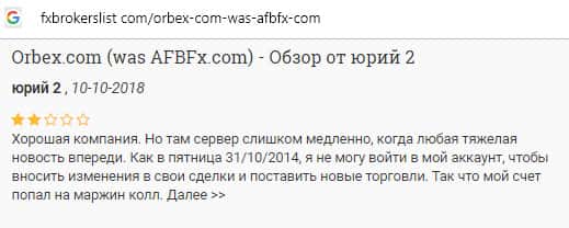 Еще один человек указывает о проблемах работы с конторой Орбекс, так как там плохо работают сервера, особенно когда появляются новости по инструменту, который торгуется. Также была ситуация, что аферисты просто заблокировали доступ трейдеру к его личному кабинету и торговому счету без объяснения причин.