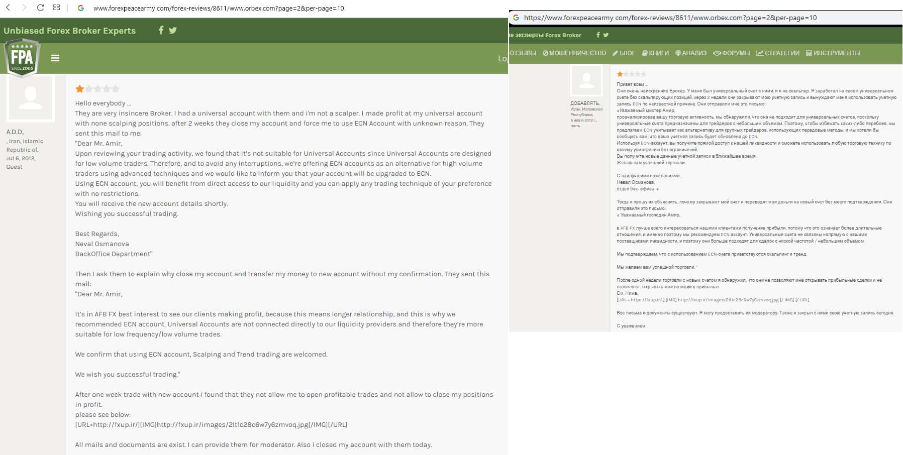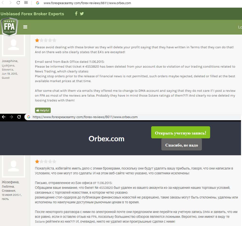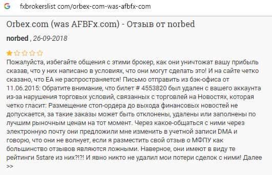 Еще один трейдер поделился историей, как он в течении 3-х недель работал с конторой Орбекс. Он вложил 1500 долларов и сумел заработать еще 900 долларов. Потом человек решил снять свои вложения и создал заявку. После того как он это сделал, все сделки достигли стопа, но не один из них не собрал, что и привело к полному аннулированию.