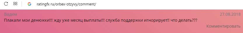 Очередной клиент рассказывает, что он жалеет о том, что связался с брокерской конторой Orbex, так как он вложил не маленькую сумму денег, а теперь уже в течении месяца, он не может вывести украденные средства. Служба поддержки все его запросы игнорирует, а больше с этим вопросом и никто помочь не сможет.