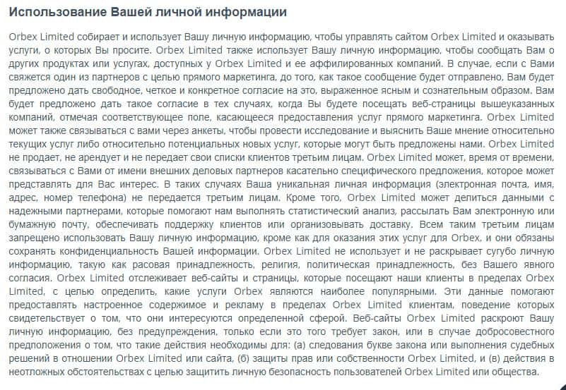 Если вы начнете сотрудничать с аферистами Орбекс, то вы должны понимать, что ваши личные данные, могут быть использованы не по назначению, так как даже в политике конфиденциальности сказано, что жулье имеет право передавать личные данные клиента третьим лицам, за действия которых они нести ответственность не будут.