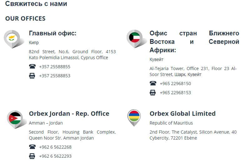 Чтобы связаться с жуликами Орбекс, следует обратить внимание на раздел о контактах. Аферисты предлагают поверить, что они имеют офисы сразу в 4 точках. Когда они украдут у вас деньги, то не понятно, в какой офис обращаться, и есть ли он вообще. Данные контакты еще не значит, что вообще кто-то выйдет на связь. Все же оставим контакты ниже: